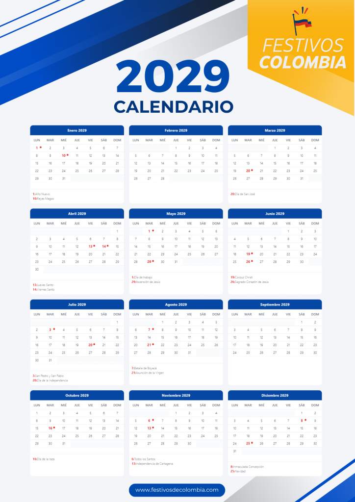 Aquí encontrarás el calendario colombiano 2029 completo, con todos los días festivos nacionales y fechas especiales que necesitas para planificar tu año.
