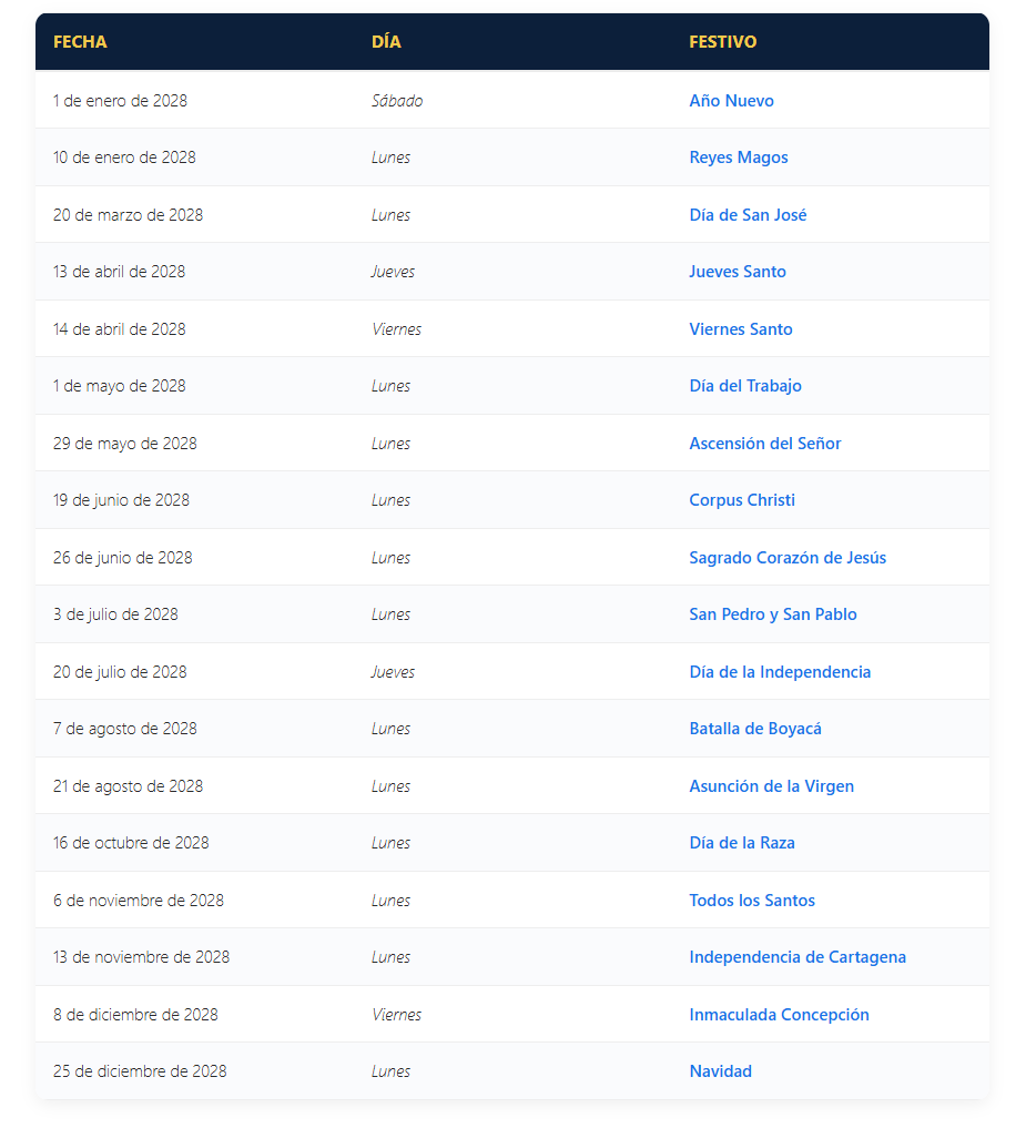 Festivos Colombia 2028